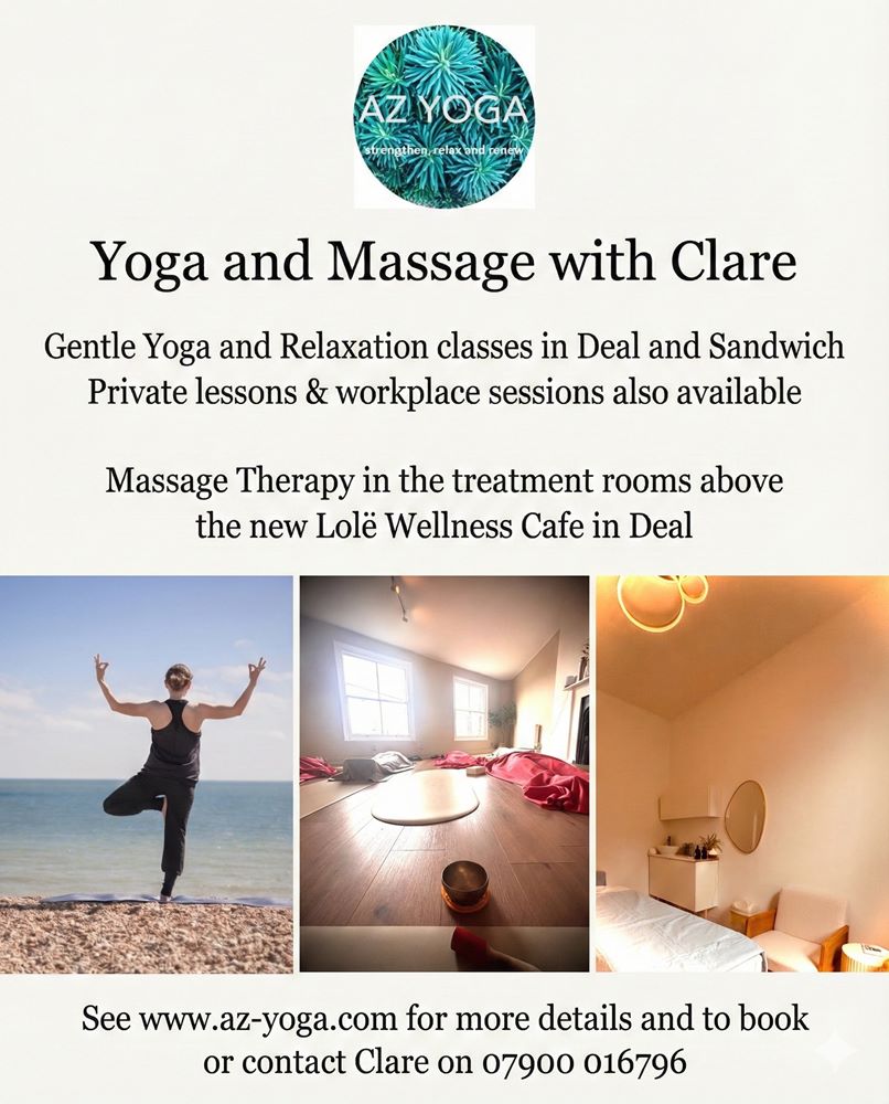 Classes in Deal and Sandwich. Massage Therapy available at Lolë Wellness Cafe in Deal. See www.az-yoga.com for full details and to book.